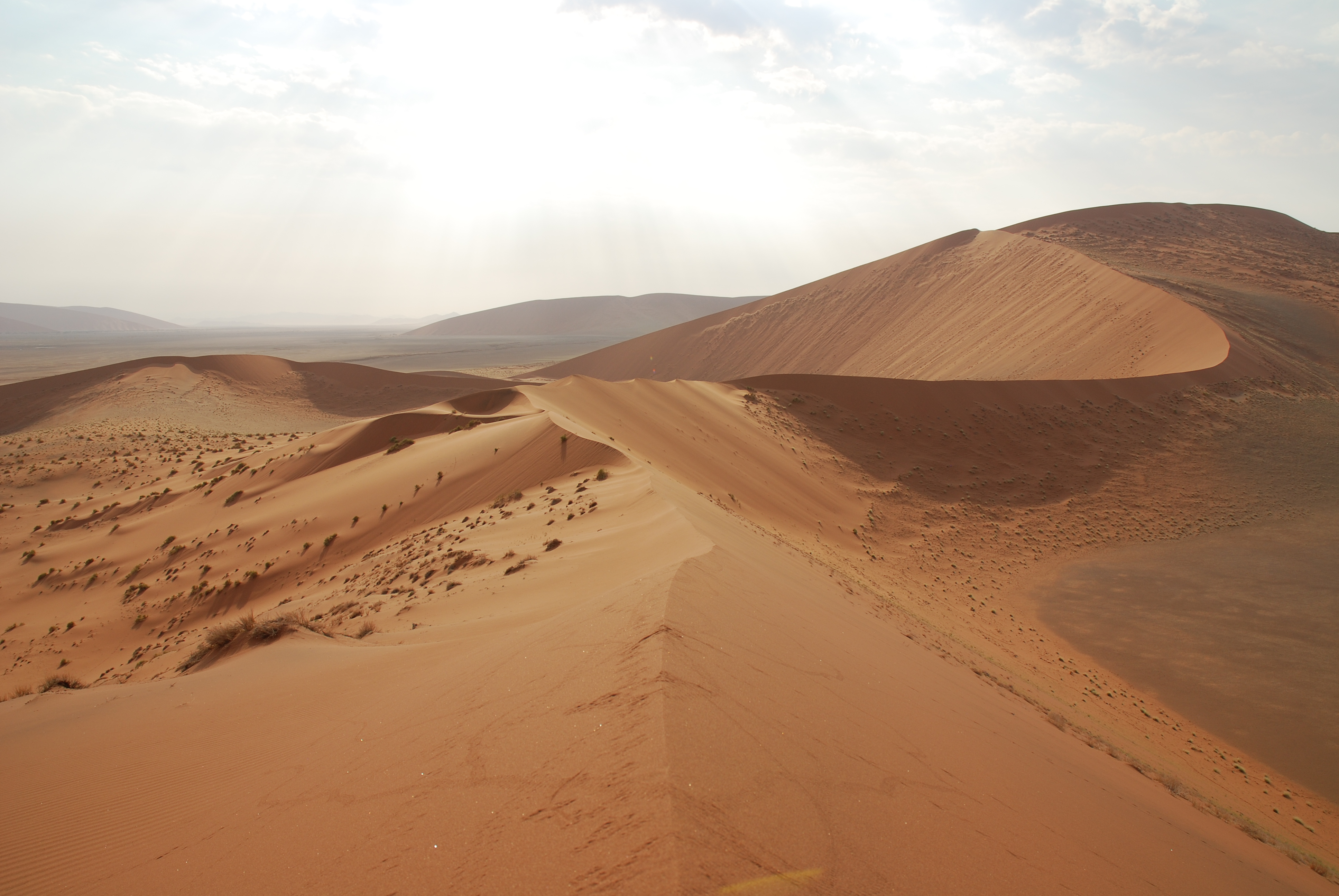 Waking up call at 4:30 in the 55 million years old desert, the world’s oldest. The morning hike in the chilly desert on top of the 170 meter high sand dune 45 rewards every traveler. It is a sense of eternity that can be felt when the first sun-rays of the day kiss awake the massiv orange san dune 45. And words cannot describes the beauty of walking along a 300 meter long orange san dune, stretching amongst 900 year old fossil Acacia trees in the white clay pan of Deadvlei. We closed our eyes and just soaked it in. Humankind has not left behind its traces in this world … yet.